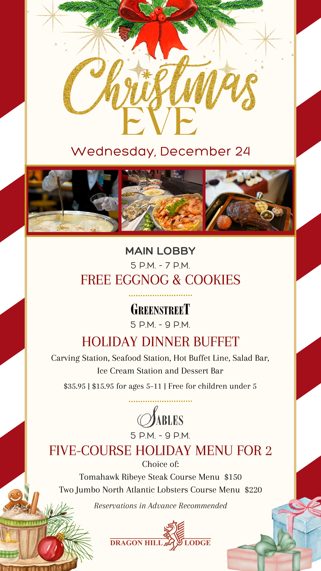 Gather with friends and family and await Santa's arrival with food specials at Sables and Greenstreet, and free eggnog & cookies at the Main Lobby.