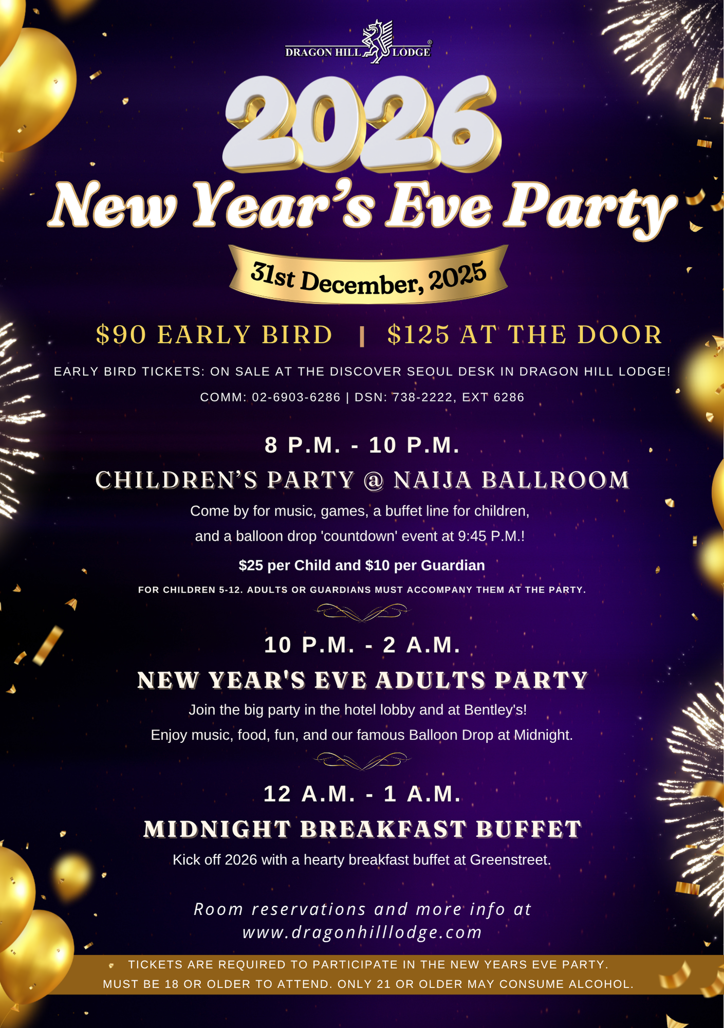 Don't miss out on the best New Year's Eve party in the USFK, with music and dancing all night long, unlimited finger food, our famous Balloon Drop at Midnight, and our Midnight Breakfast Buffet at Greenstreet.