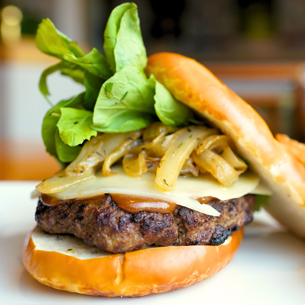 Sink your teeth into our signature sirloin burger, smothered in rich whiskey sauce and topped with melted Swiss cheese, savory Guinness onions, and fresh arugula. Served on a warm pretzel bun.