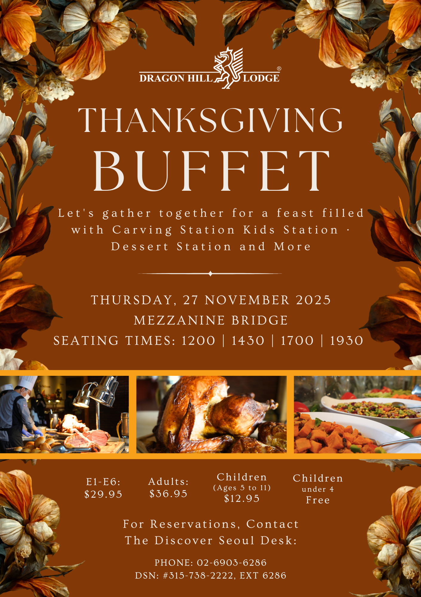 Our annual Thanksgiving Buffet will be held on the Mezzanine on Thursday, November 27th. Come enjoy the greatest Thanksgiving spread in all of the USFK, featuring all your favorite holiday foods, some of our signature entrées & sides, a kid's buffet line, and many homemade pies and desserts.