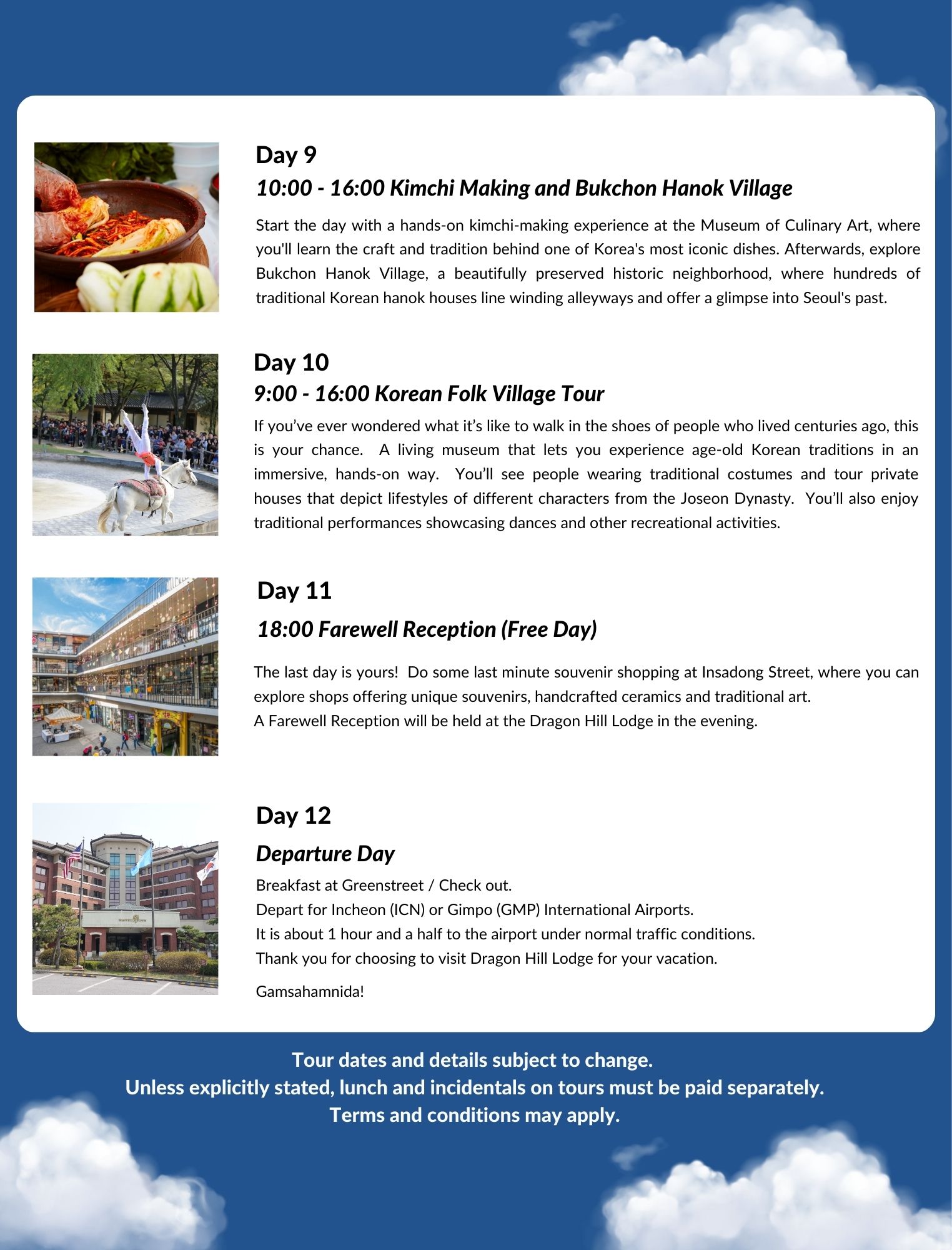 Additional days may be reserved through our Reservations Department and additional tours may be booked through our Discover Seoul Desk.