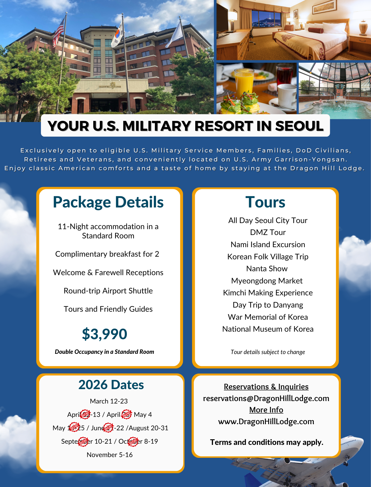 Dragon Hill Lodge is located on U.S. Army Garrison Yongsan. You must have proper identification to enter the installation and be an eligible guest to book this package. (Click here for more information on eligibility)