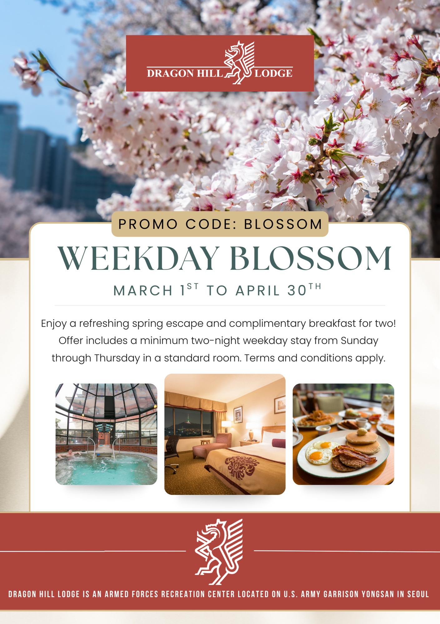 Celebrate spring in Seoul with our Weekday Blossom room package, perfectly timed to enjoy the city's breathtaking cherry blossoms. Staying at Dragon Hill Lodge places you within easy reach of some of the most beautiful blossom-lined streets, parks, and riversides in the city.